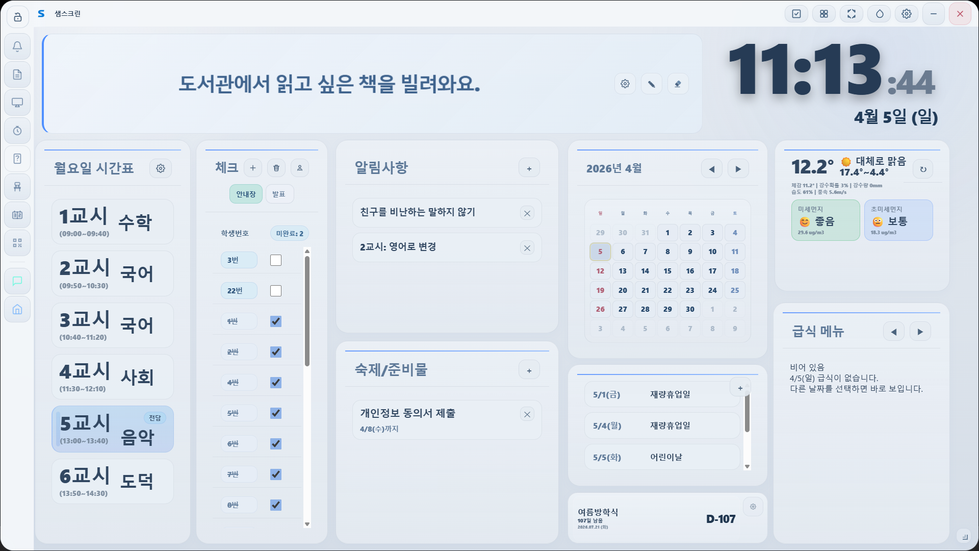 교실 운영 흐름에 맞춰 기능을 세 갈래로 나눴습니다. 먼저 화면에 띄우는 정보, 수업 중 바로 여는 도구, 한 번 설정해 유지하는 항목 순서로 보시면 됩니다.